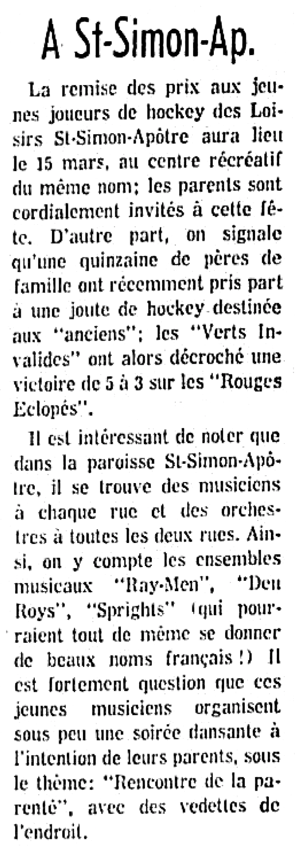 Les musiciens des Sprights sont: André Cormier, orgue, Pierre Daigneault, saxophone, André Graveline, trompette, Serge Brabant, guitare, Germain Brunette, contrebasse et Bernard Jetté, batterie.