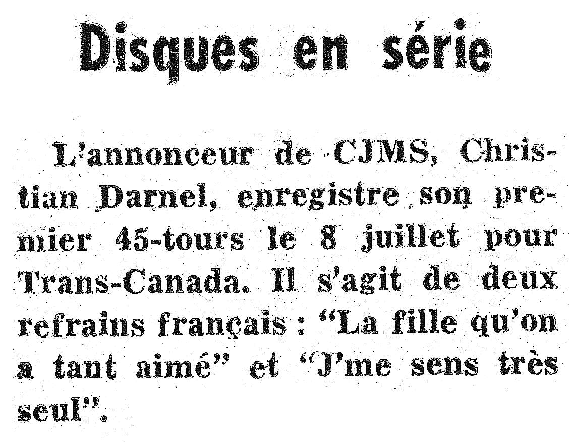 Christian Darnel fut animateur, annonceur et journaliste. Il a débuté à CJMS, mais a poursuivi sa carrière à CKVL. Déjà en 1963, il enregistra un premier disque, puis un second, le dernier, en 1972.