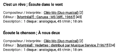 Après avoir quitté "Les Pieds Fous", Cléo (Diane Lavoie) et Mo (Maurice Bélanger, ancien Romain de César) réalisèrent deux simples: l'un sur étiquette CANUSA et l'autre, sur étiquette VEDETTES.