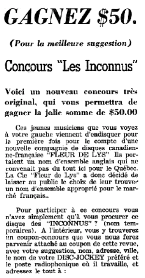 En effet, ce groupe possède déjà un nom anglophone (non mentionné), ce qui était très courant à l'époque. Comme cette formation aura l'honneur de produire le premier disque de la nouvelle compagnie "Fleur de Lys", il serait plus convenable de lui trouver un nom francophone en organisant un concours en collaboration avec la revue "Dis-Q-Ton". Les Inconnus sortiront un deuxième disque sous ce même nom. L'histoire ne précise pas le nouveau nom du quintet.