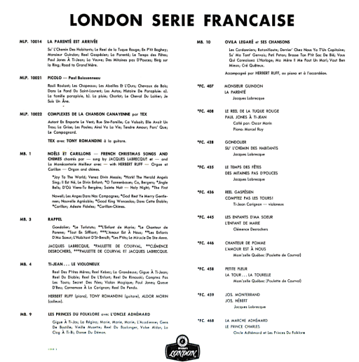 Québec... à la mode! avec l'orchestre d'Alphonse Ghédin, London MB 13 - verso