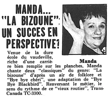 Manda a brillé comme comédienne de burlesque, mais aurait pu aussi ajouter une corde à son arc: la chanson fantaisiste. Elle a produit un seul disque sorti en 1969.