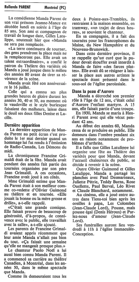 Manda avait épousé le frère du chanteur Lionel Parent qui a enregistré chez Starr entre 1935 et 1946 pas moins de 194 chansons, ce qui en fait l'artiste qui a le plus endisqué durant cette période.