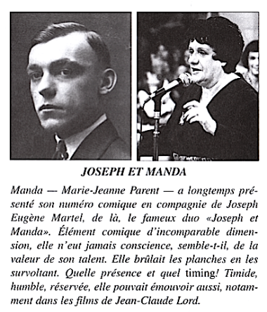 C'était l'usage dans le burlesque d'adopter un pseudonyme de scène. Eugène Martel, qui avait adopté le surnom Joseph, suggéra à Marie-Jeanne d'adopter celui de Manda. Ils firent un duo pendant quelques années "Joseph et Manda".