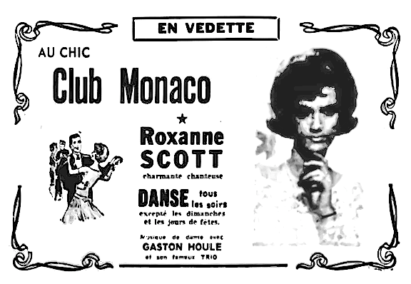 des cabarets. À partir de 1961, j'ai relevé dans la presse une vingtaine d'annonces faisant part de sa présence dans différents lieux de la province: Saint-Hyacinthe, Sherbrooke, Trois-Rivières, Shawinigan, Maskinongé, Québec... La dernière trace s'arrête au début de 1966.