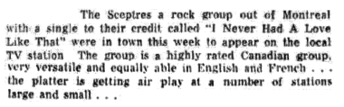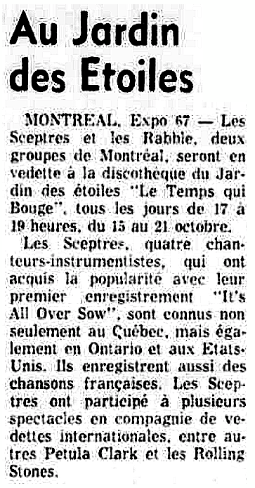 Groupe anglophone de Montréal (Pointe-Claire) avec Tim Hewlings (guitare), Bill Ott (guitare basse), Marty Butler (orgue) et Tyler Williams (batterie) ayant réalisé huit 45 tours (dont deux entièrement en français) entre 1965 et 1969. Les Sceptres ont eu la chance de prendre part à un spectacle en compagnie des Rolling Stones. Leur réputation a traversé les frontières, notamment celles de l'Ontario et du Nord-Est américain.