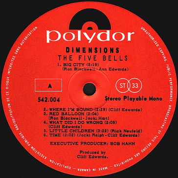 Groupe montréalais de musique populaire actif principalement de 1965 à 1973. Constitué de Cliff Edwards (voix, guitare) et de Anne Ralph (ultérieurement Edwards, voix), The Five Bells interprète de la musique populaire grand public dans des endroits haut de gamme : boîtes de nuit, bars salons et hôtels au Canada, aux États-Unis et dans les Caraïbes. Les autres membres du groupe original sont Jacki Ralph (ultérieurement Jamieson, voix), Doug Gravelle (batterie) et Gordie McLeod (clavier). À Montréal, en 1969, ils enregistrent leur premier album, Dimensions (542-004 Polydor). Le 45 tours « Moody Manitoba Morning », composé par Rick Neufeld, connaît un certain succès à la radio.