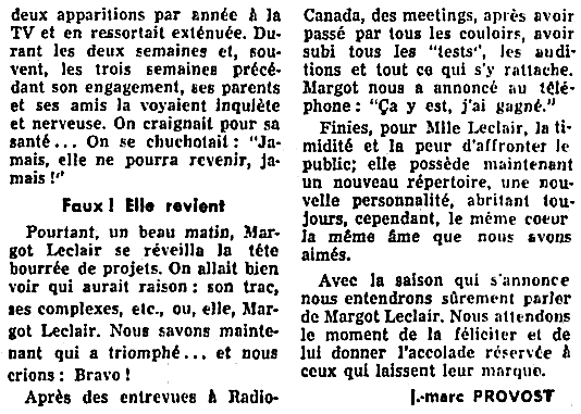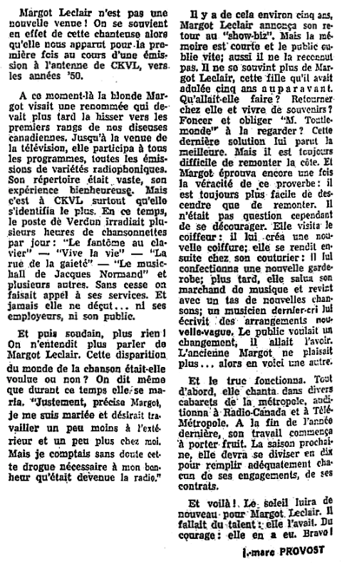 Margot Leclair manifeste très jeune des aptitudes pour le chant et est bientôt surnommée «la Shirley Temple canadienne» à cause de sa ressemblance avec la jeune vedette américaine. Après avoir fait sa première apparition publique lors d'un pique-nique de l'Association du Bien-être de la jeunesse à l'île Sainte-Hélène, elle étudie la diction avec madame Melançon, le chant avec Roger Larivière, puis la musique avec Léo Lesieur et Pat Marazza. Elle fait ses premières armes à la radio dans le cadre d'un concours d'amateurs de la Living Room Furniture en 1946. Elle se produit ensuite avec une troupe au Stade Ontario en septembre 1946. Quelques autres succès similaires à CKAC, CBF et CKVL donnent à Margot Leclair suffisamment d'expérience pour remporter une bourse d'étude à l'émission «Les horizons dorés» à CKAC en 1948. On peut ensuite l'entendre aux émissions «Chansons populaires» (CKVL), «Opportunity Knocks» (CFCF) et «Le marchand de bonheur» (CKAC). Elle a enregistré, en 1948, quelques chansons d'auteurs québécois dont Ne m'oublie pas et Vivons notre jeunesse d'André Mirande. Après avoir quitté le métier en juillet 1954 à la suite de son mariage avec Charles Johnson, elle y revient à l’automne 1959 puis quitte définitivement le métier en 1965 pour s’occuper de sa famille. Elle est devenue secrétaire dans une étude médicale. Margot Leclair est décédée en avril 1972.
