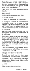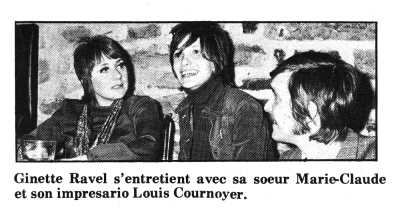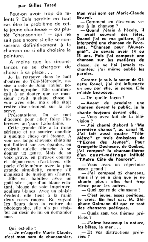 est bien celle de Marie-Claude, la soeur de Ginette Ravel. Elle devait avoir environ 23 ans lors de l'enregistrement. Dans l'hebdomadaire "Échos-Vedettes" du 8 mars 1969, apparaît le nom de Marie-Claude parmi les nouveautés (disques) mentionnées en vrac. Elle partait l'année suivante avec son copain pour un séjour de plusieurs mois en Afrique noire. Après la parution de son microsillon en 1963 (á l'âge de 17 ans), elle est devenue mannequin pour l'agence Constance Brown, rapporte le journaliste de "Nouvelles Illustrées", Jean Lorrain, dans l'édition du 12 septembre 1970.