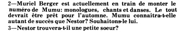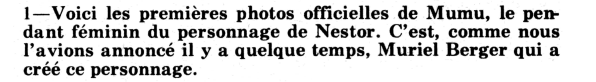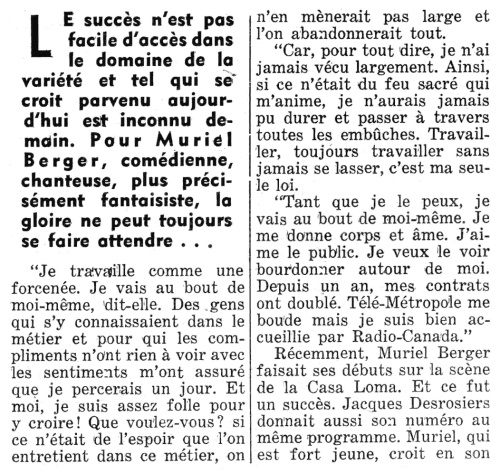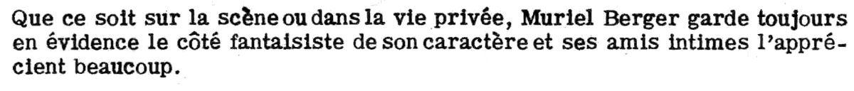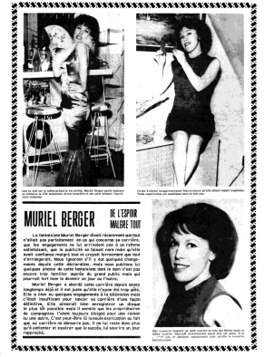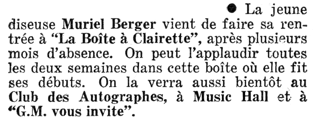 En consultant le catalogue Iris de la BAnQ, on trouve le nom de Muriel Berger sur deux 45 tours et sur un 33 tours (artistes variés) de la maison de disques "Astra": Christmas sampler from Astra - Échantillon de Noël d'Astra. Elle y interprète deux chansons aux titres assez contradictoires: "Méchant, méchant. méchant Père Noël" et "Mon beau Père Noël". "Les fesses blanches"est une reprise chantée en France par Lucette Raillat dans les années '60. L'autre simple propose deux chansons originales: "Les petites souris" et "Une maman".
