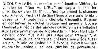 Le nom de Nicole Alain figure dans le livre de Michel Louvain "La chanson, c'est ma vie" p.22